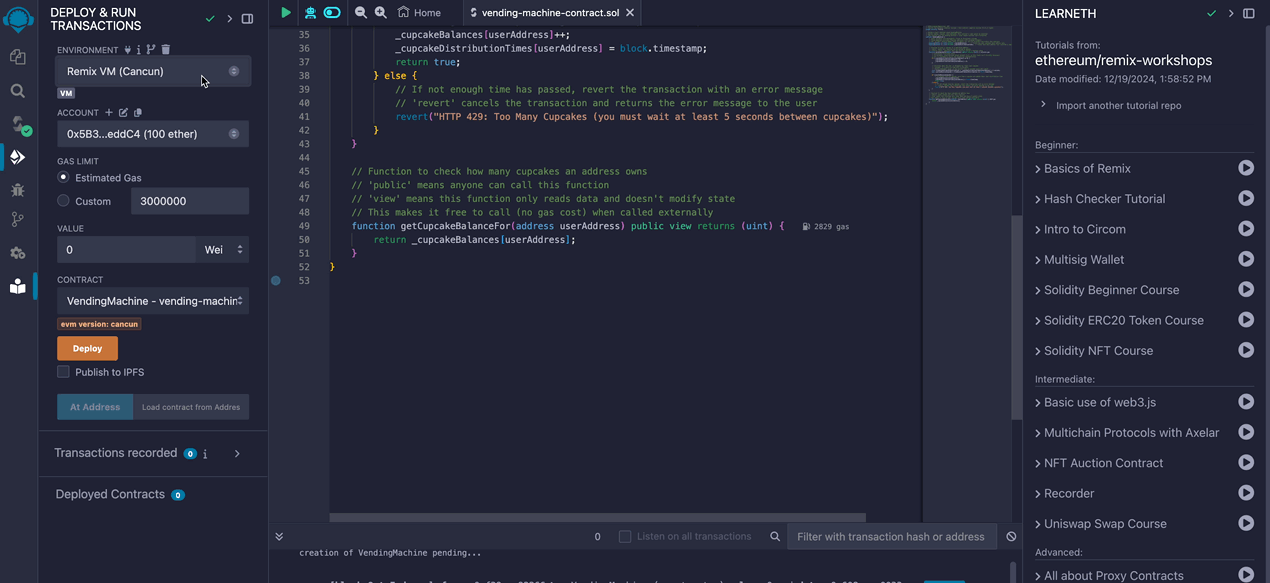 - Converted a vending machine's Javascript business logic into a Solidity smart contract.